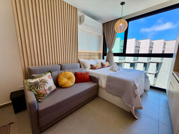 Preparamos cada detalhe do Studio Rooftop Brisa para garantir seu descanso merecido com o máximo de estilo e funcionalidade, complementando a exclusividade do seu rooftop privativo.